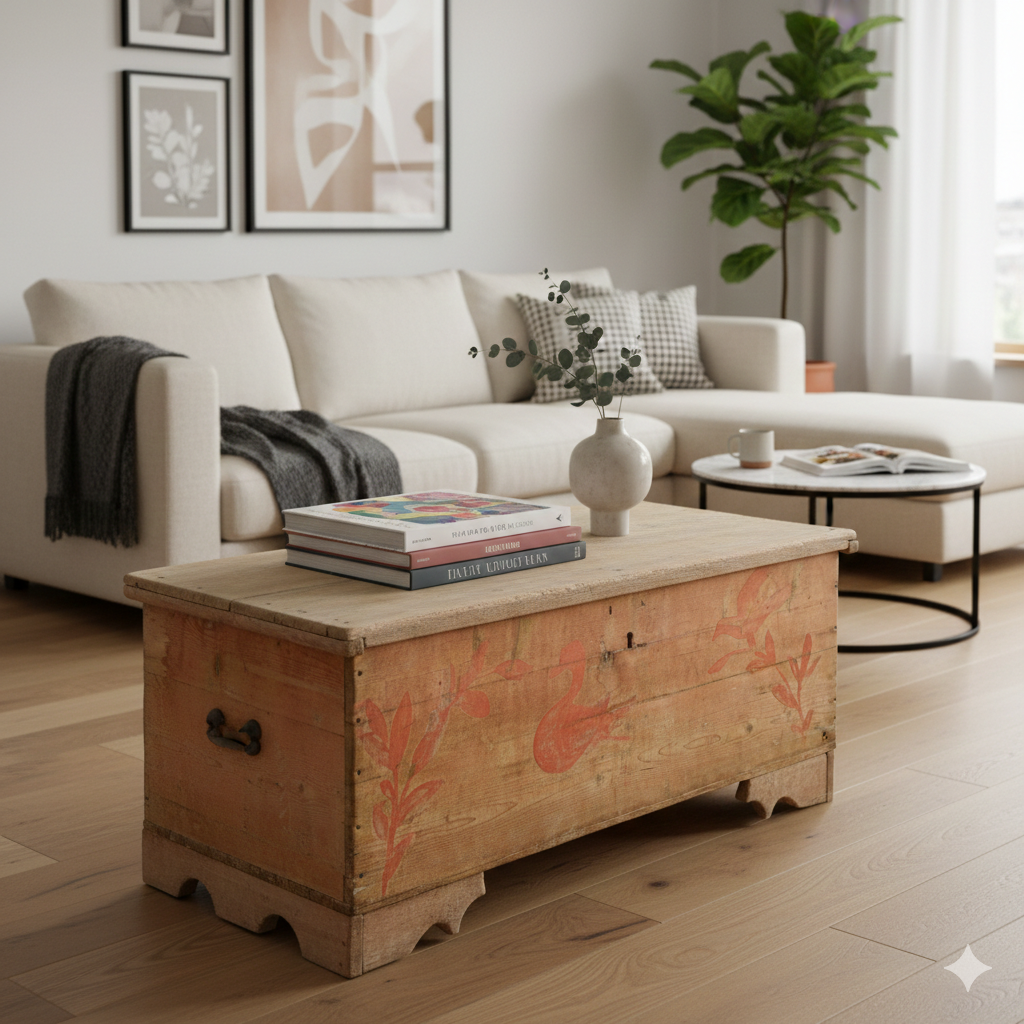 Questo affascinante baule in legno massello rappresenta un autentico esempio di artigianato popolare d’epoca. Caratterizzato da una struttura solida e lineare, il pezzo evoca il fascino delle dimore rurali del passato, integrandosi armoniosamente in contesti d'arredo rustici o vintage ricercati. Il fronte è impreziosito da decorazioni pittoriche fatte a mano, che raffigurano un cigno centrale affiancato da delicati motivi floreali in tonalità arancio. I piedi sagomati e la patina naturale del legno sottolineano l’autenticità e il valore storico di questo oggetto da collezione. L’ampio vano interno offre una soluzione contenitiva versatile, ideale per organizzare tessili o altri oggetti. Posizionato ai piedi di un letto o utilizzato come originale tavolino da caffè in un ambiente di modernariato, questo baule aggiunge carattere e calore a ogni spazio abitativo.