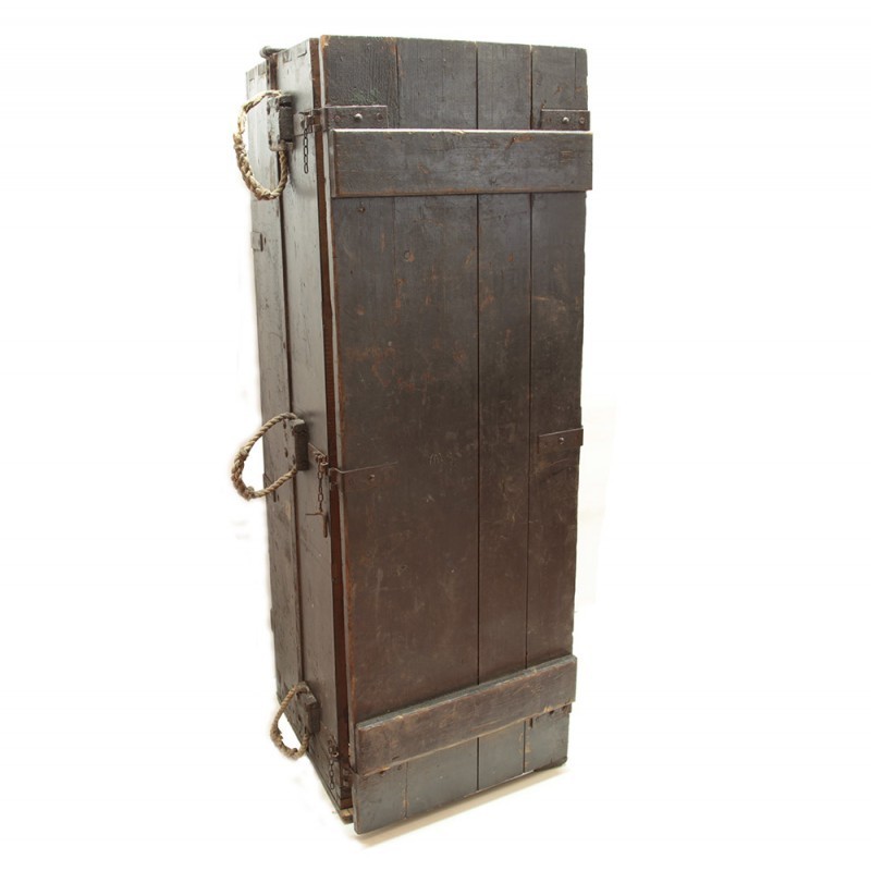 Baule cassa marina militare color verde rame , che conteneva un unico proiettile da artiglieria navale , completa di ganci superiori e maniglia in corda risale alla prima guerra mondiale.la cassa è stata ripulita e internamente sono stati realizzati dei ripiani in modo da poterlo utilizzare come credenza, dispensa, stipo. Misure: larghezza cm 62 x altezza cm 167 x profondità cm 62
